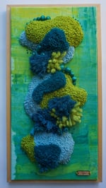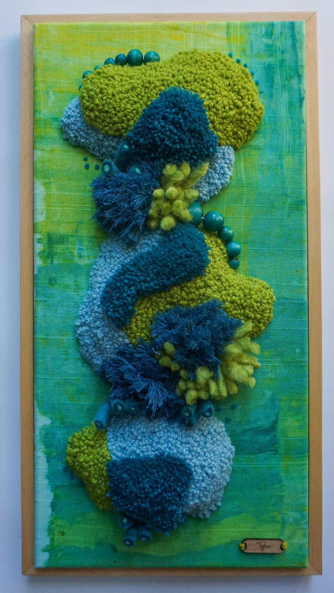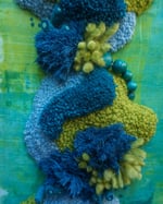 I hand-painted the fabric using fiber-reactive dye and then hand-stitched the punch needle segments onto the fabric like puzzle pieces.