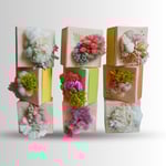 Attached to a 4x4-inch block of wood painted in yellow, pink, blue or green.