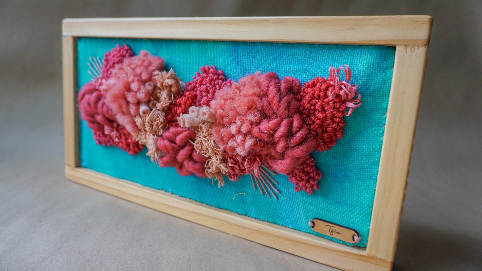Punch Needle Fiber Art 15” x 8” Wool, cotton and silk fibers. Hand-painted monk's cloth with fiber-reactive dyes. Hand-drilled and hand-made wooden frame. Cloth is stitched to the inside of the frame.