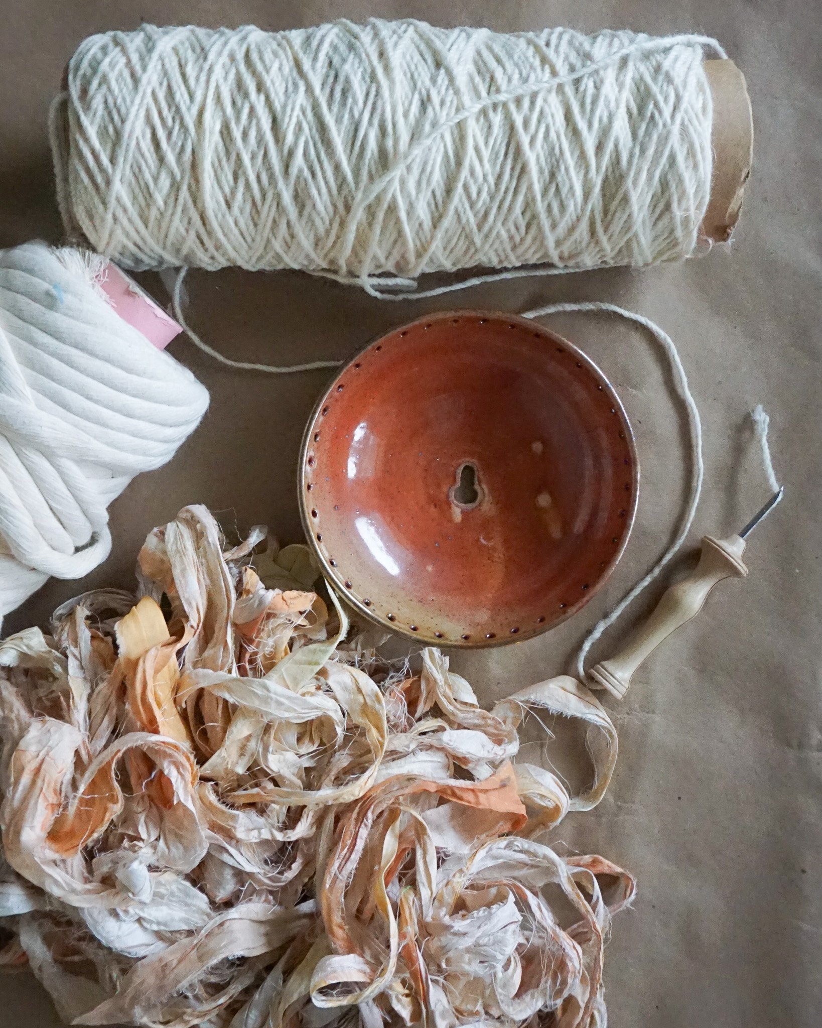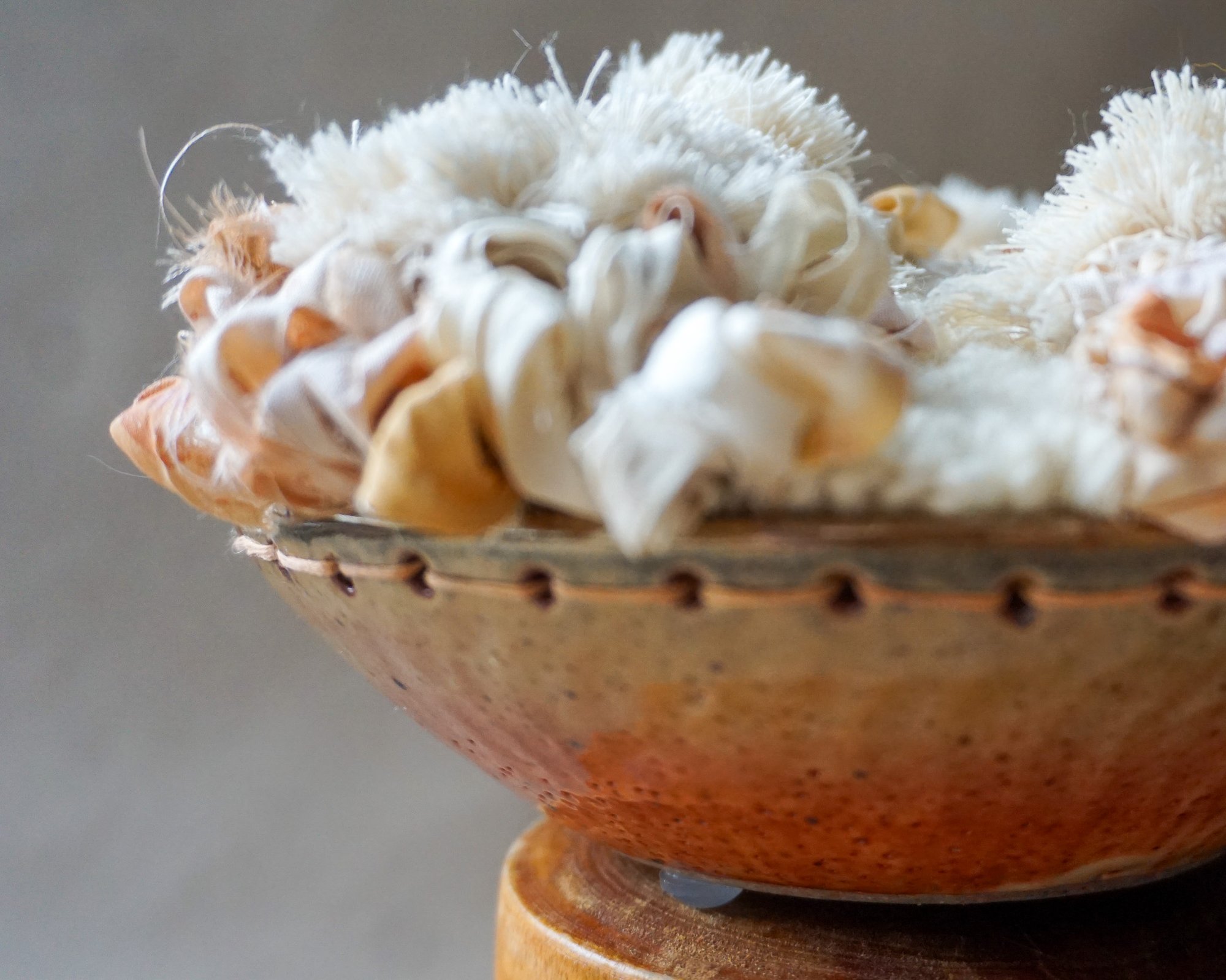 Punch Needle and Embroidery techniques are used to create a fiber rug hand-stitched into a handmade clay vessel.