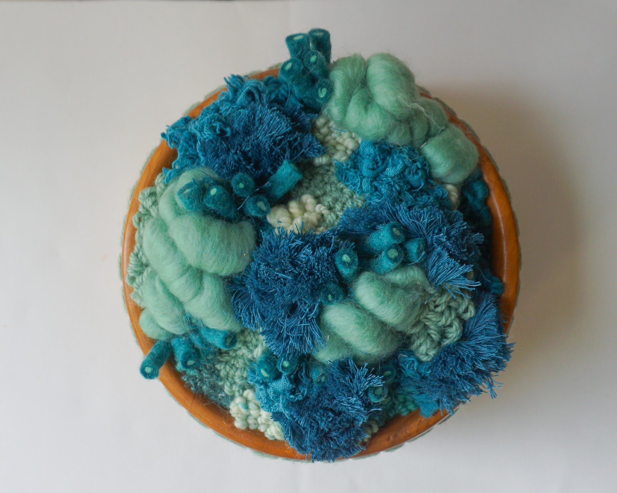 Punch Needle and Embroidery techniques are used to create a fiber rug hand-stitched into a reclaimed hardwood vessel.