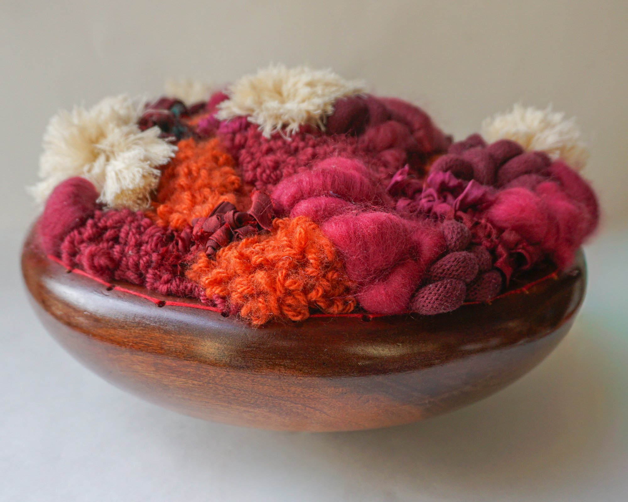 Punch Needle and Embroidery techniques are used to create a fiber rug hand-stitched into a reclaimed hardwood vessel.