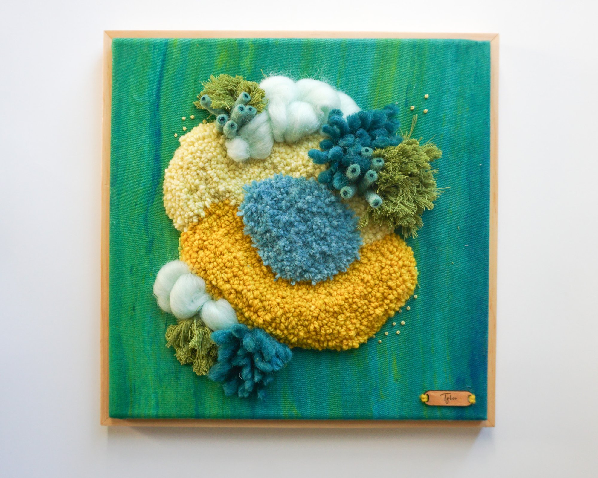 I hand-painted the fabric using fiber-reactive dye and then hand-stitched the punch needle segments onto the fabric like puzzle pieces.